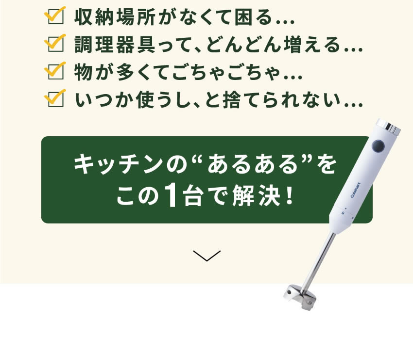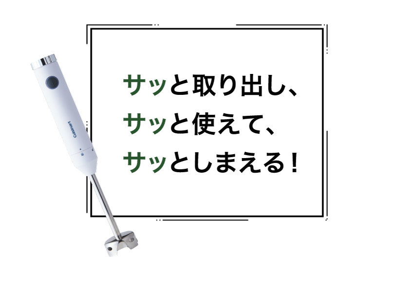 某雑誌で使いやすさナンバーワンでしたので、購入しました。今まで、ミキサーとフードプロセッサー、泡立て器を使いわけていましたがこれ一台で済むように。使い心地、片付けやすさ、省スペース、もっと早く購入すればよかったです。