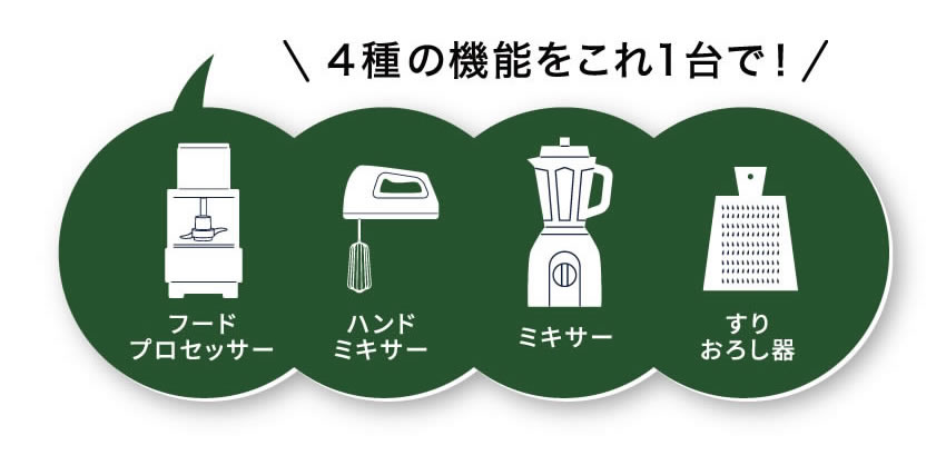 フードプロセッサー、ジューサー、ミキサー、ハンドミキサーで場所を取ってたので一体化できて満足です。操作もシンプルで使い勝手がいいし、とても洗いやすいです。泡立て器が二本タイプなのも気に入っています。