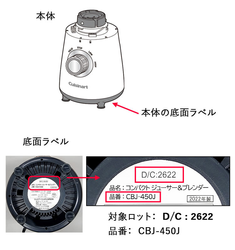 弊社が2022年7月に輸入した「クイジナート コンパクト ジューサー&ブレンダー CBJ-450J」の一部製品でブレンダーの刃が調理中に外れて、調理物に混入したり、使用者等がけがをするおそれがあることが判明いたしました。