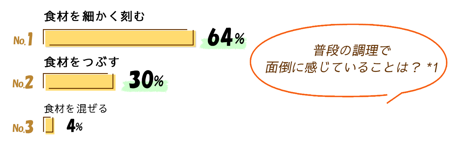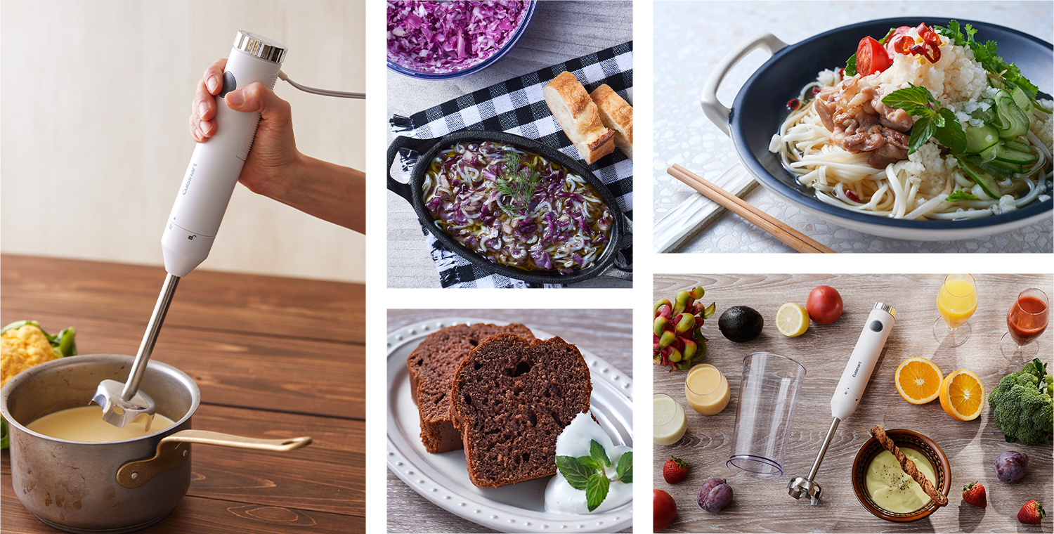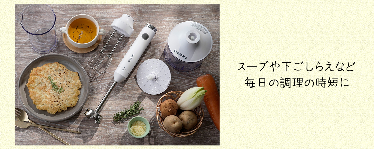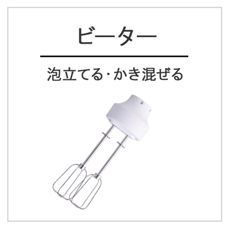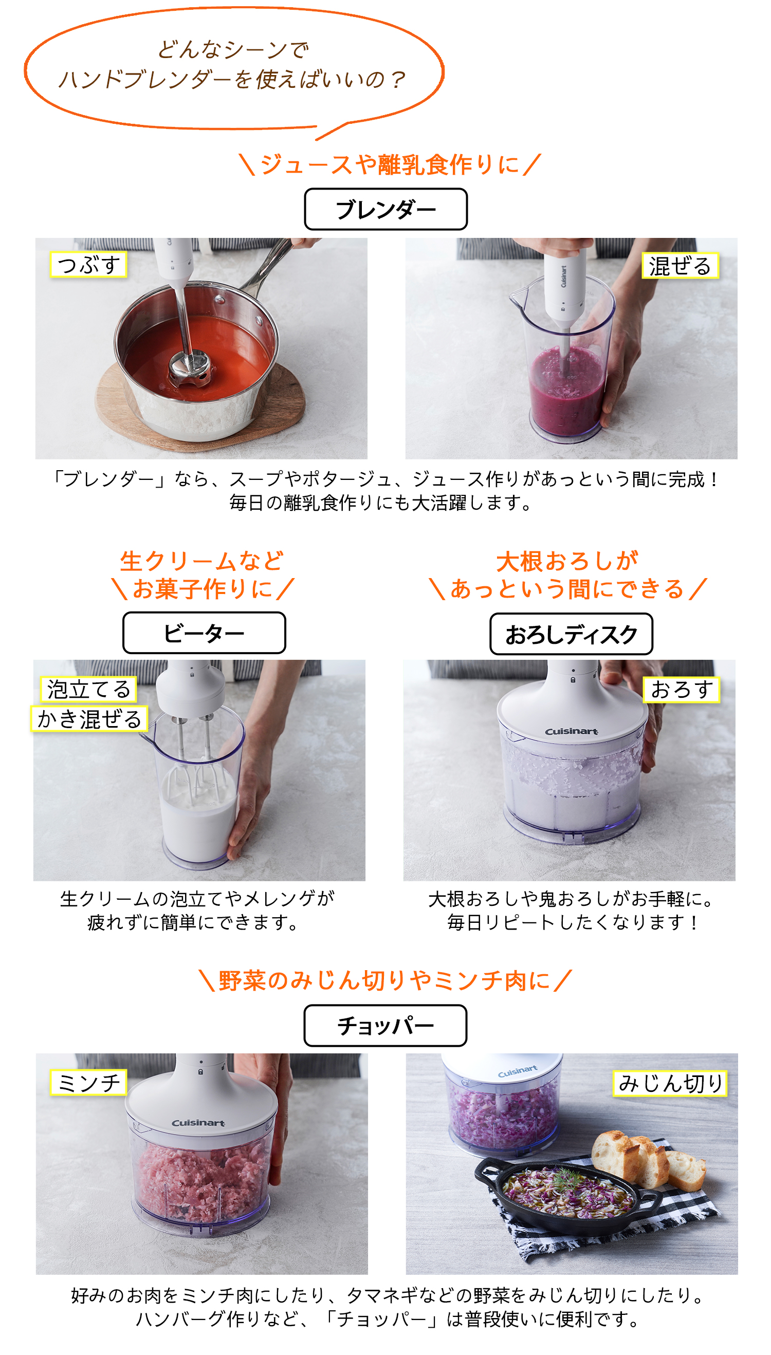 付属のアタッチメントを付け替えるだけで、つぶす・混ぜる・泡立てる・かき混ぜる・おろす・ミンチ&みじん切りといった動作があっという間に簡単にでき、時短につながります!