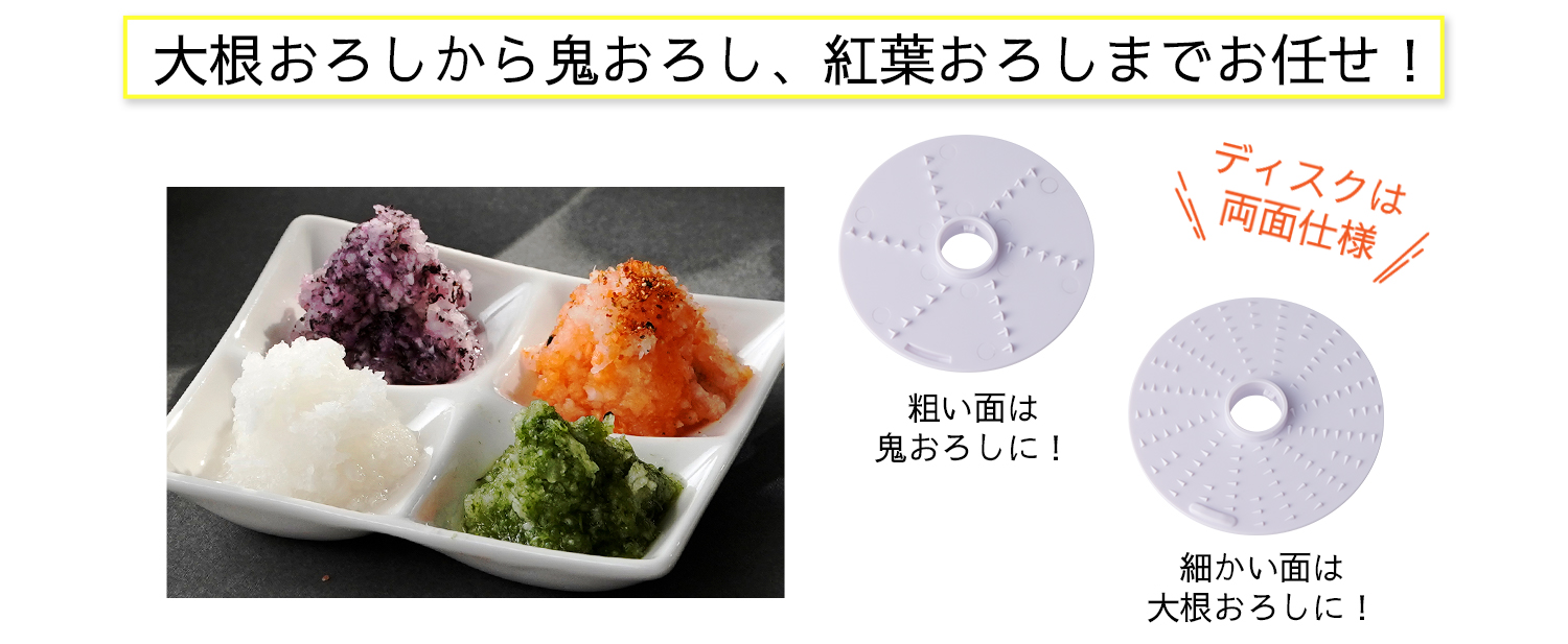大根おろしはもちろん、鬼おろしや紅葉おろしも手間なく簡単にできます。