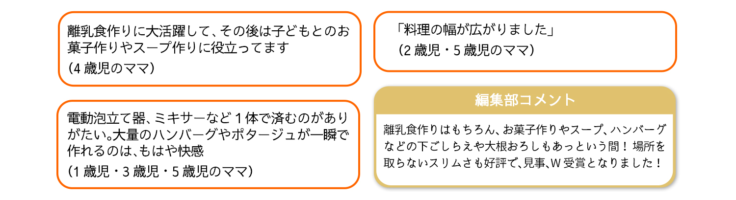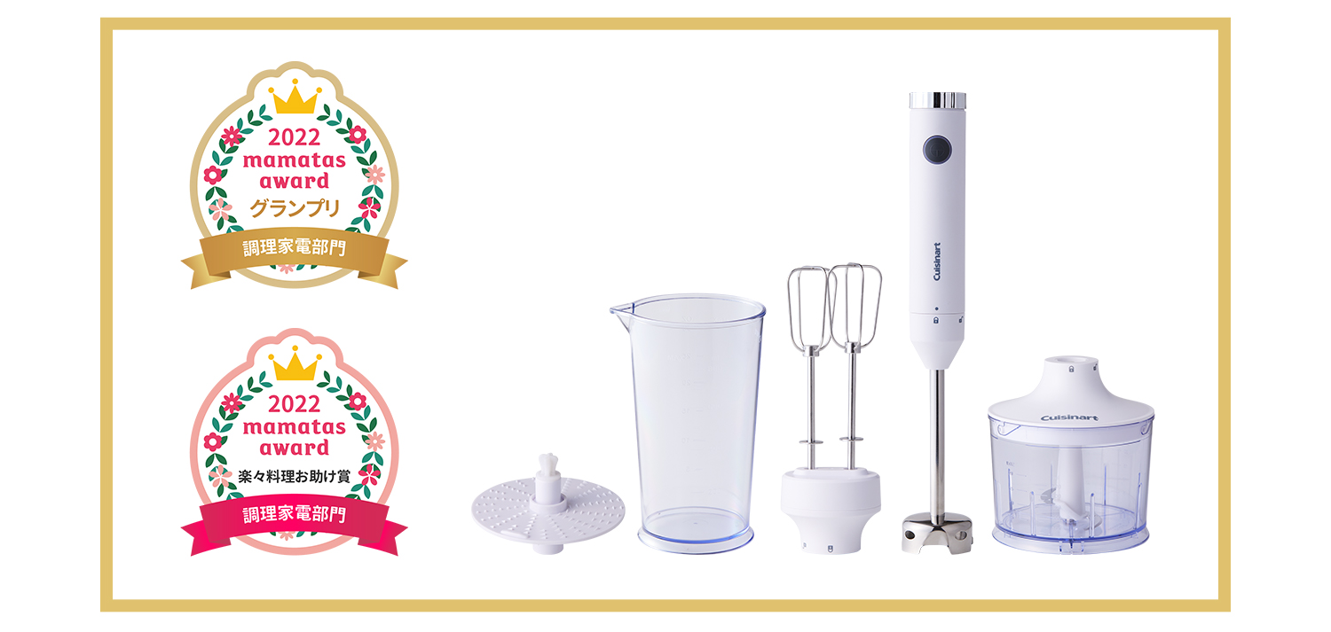 子育て中のママパパを助けてくれるモノやコトを選ぶ「ママタスアワード2022」にて、クイジナート「スリム&ライト マルチハンドブレンダー おろしディスク付」(HB-704WJ)が「調理家電部門グランプリ」と「楽々料理お助け賞」をW受賞しました!