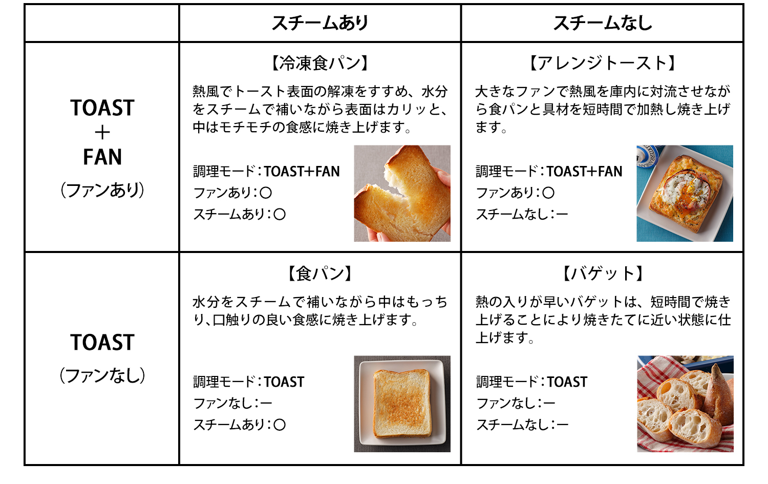 保存していた冷凍食パンやアレンジト―ストなど、パンに合わせて4つの焼き方を使い分けることでパンの美味しさを引き出します。