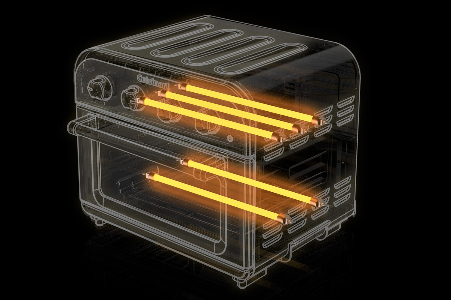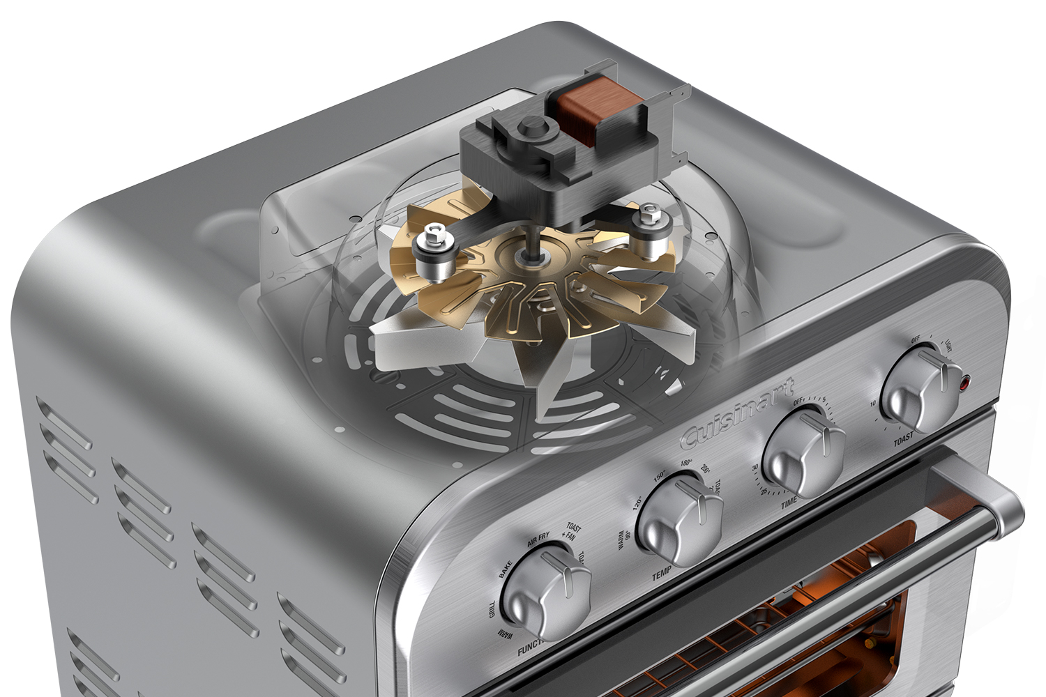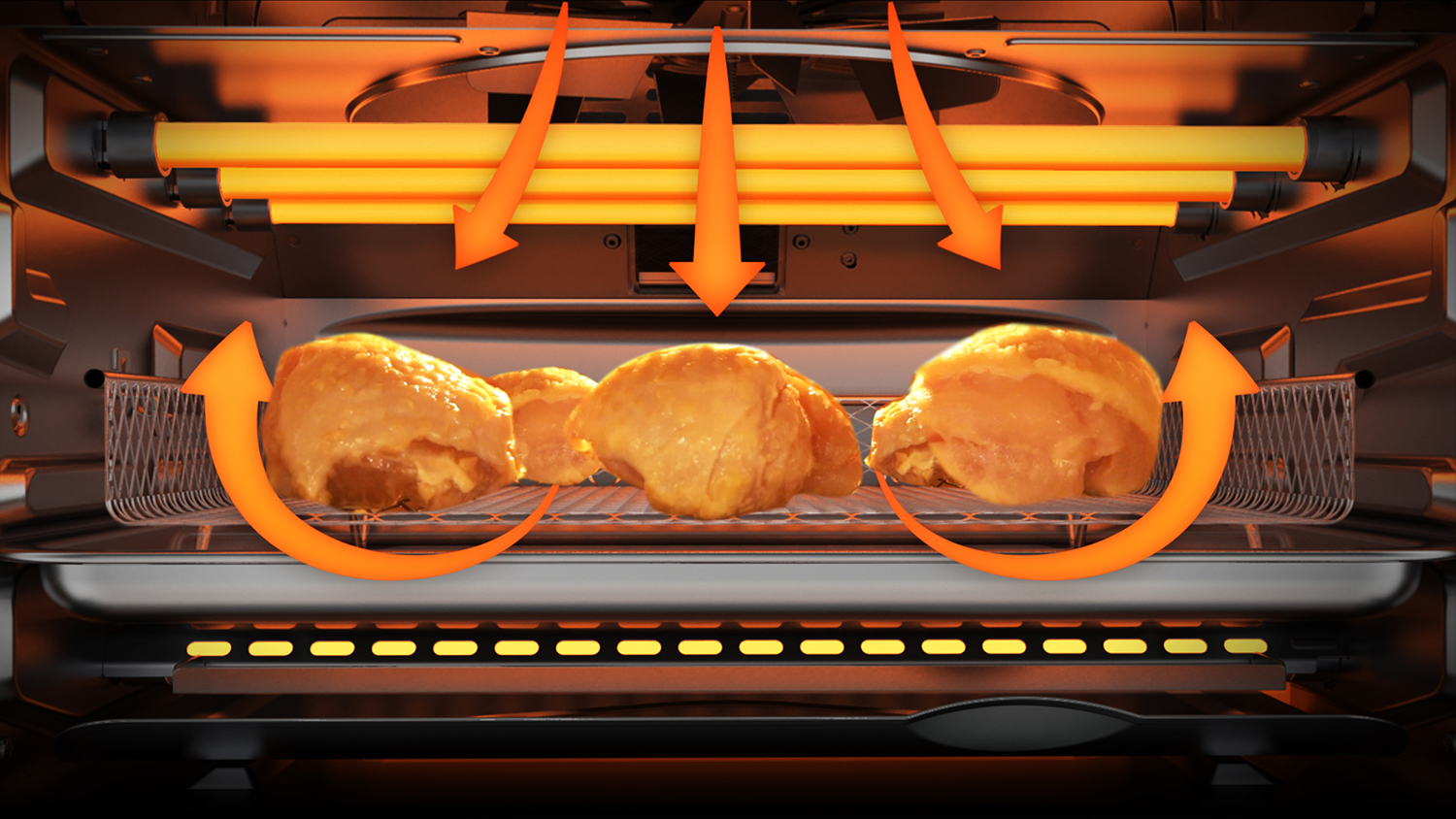 庫内天面にクイジナート最大の特長である大型ファンを搭載。大型ファンが起こすパワフルな熱風を効率的に庫内循環させ、短時間でムラなく食材を加熱し、旨味を閉じ込めて調理します。