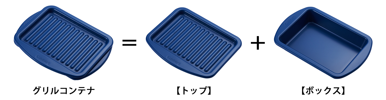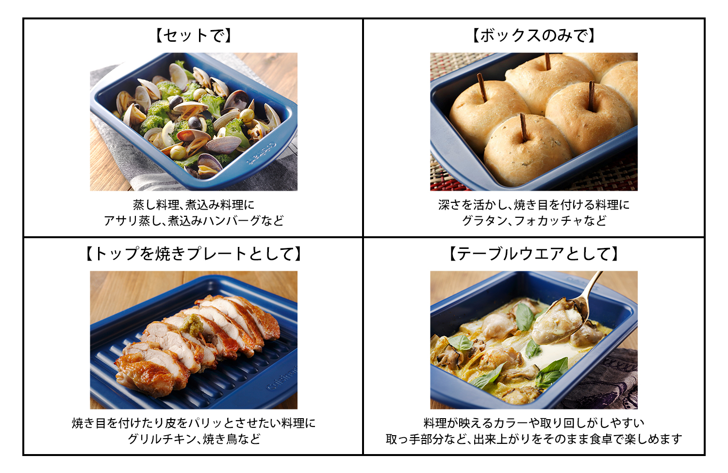 調理だけでなく、テーブルウェアとしても使える4WAY仕様のグリルコンテナが付属。セット、トップ、ボックスそれぞれでもセットでも調理に合わせて使い分けられます。