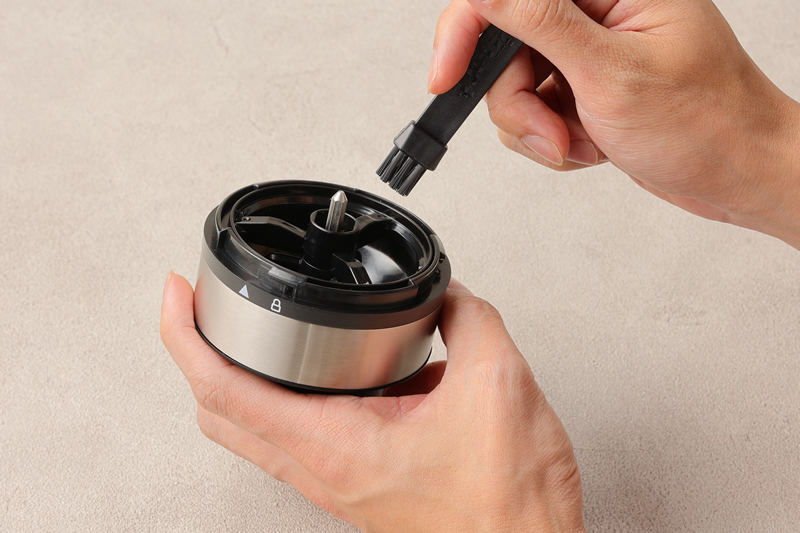定期的なミルユニットのお手入れをおすすめいたします。コーヒー豆ケースが空になった際に、ミルユニットをコーヒー豆ケースから外し、付属のクリーニングブラシでミル内部のコーヒー粉を取り除いてください。(水洗いはできません。ミル刃部分は手で触れないようご注意ください。)
