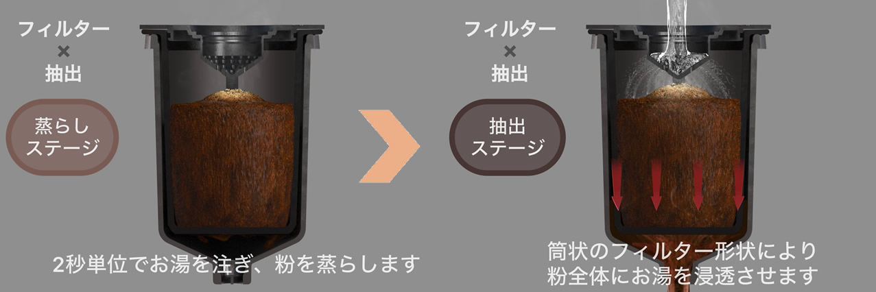 深さのあるフィルター形状により、コーヒー粉の層を厚く作り、粉全体に湯を浸透させることが可能に。