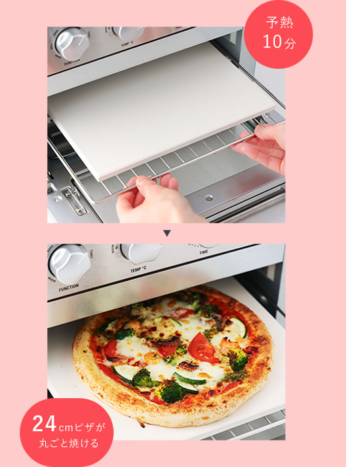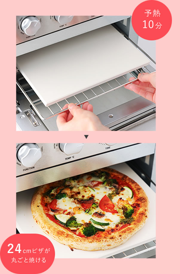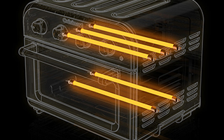 天面の大型ファンにより熱風が庫内と対流し、熱を均一に保ち、上下に配置された5本のヒーターで焼ムラのない仕上がりに。スチームで水分をを補い、カリッもち食感。