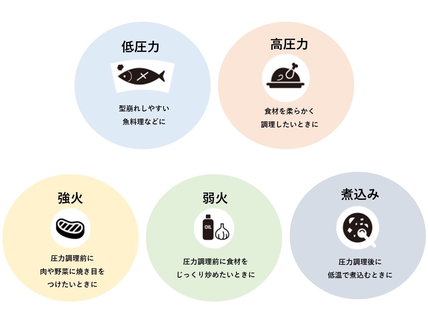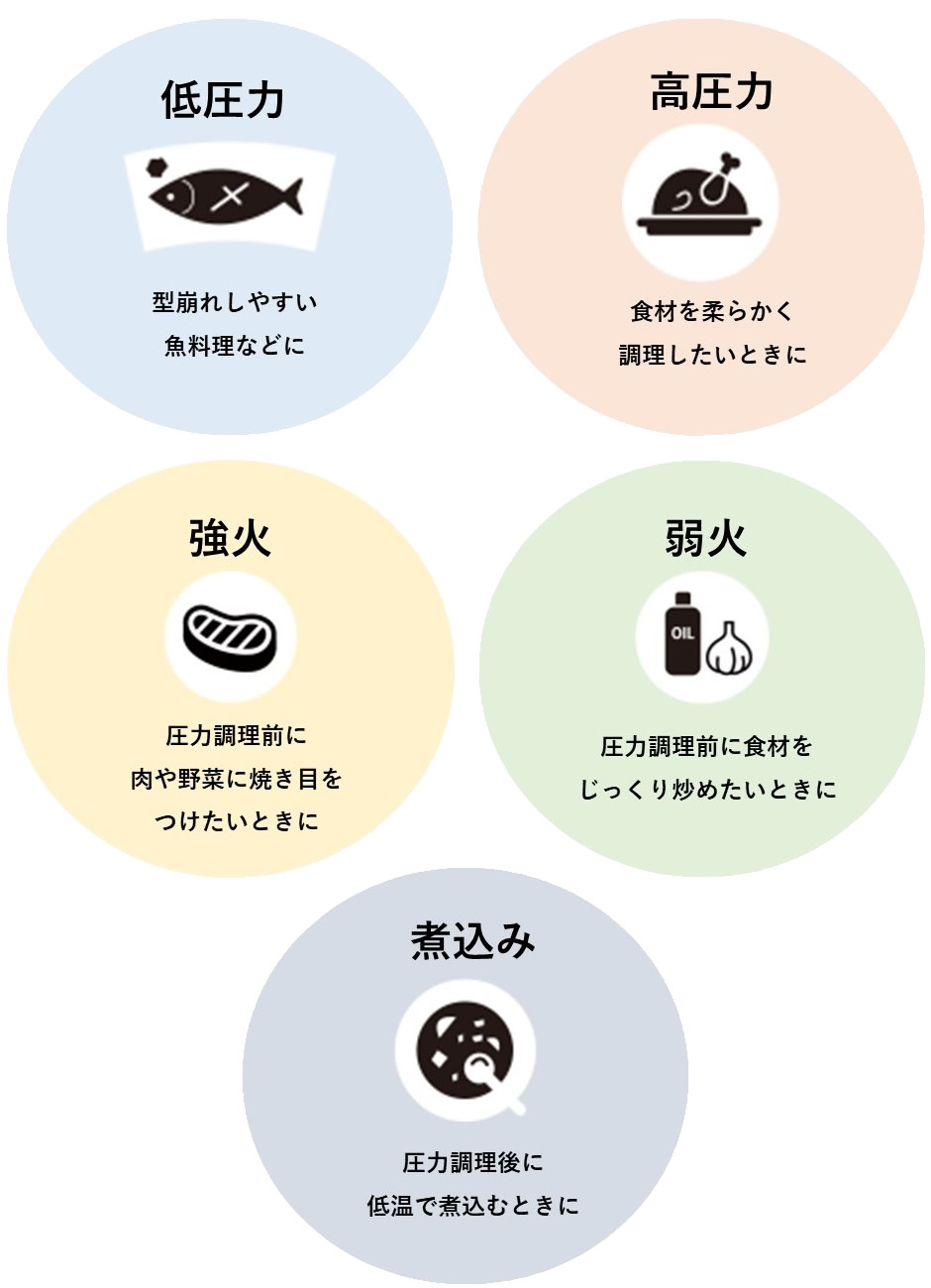 「低圧力」、「高圧力」、「強火」、「弱火」、「煮込み」の厳選した調理モードをお好みの調理に合わせて組み合わせて使うことで、料理のレパートリーが広がります。
