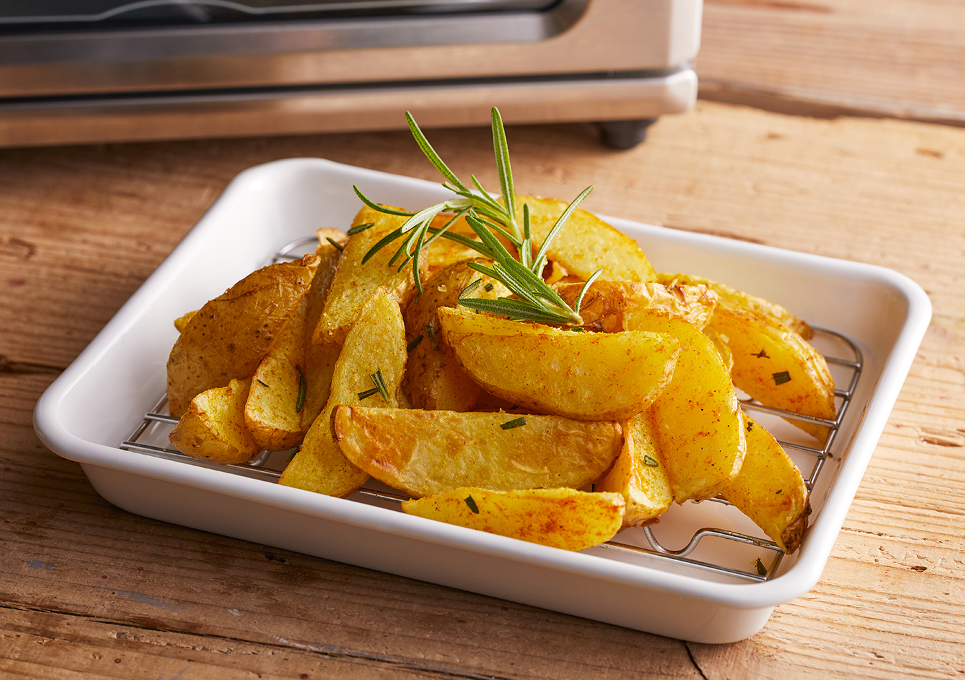 3. メッシュバスケットに2をのせ「AIR FRY」200度で12分程度加熱し、ローズマリーのみじん切り、カレー粉、塩を全体にまぶして味を調える。