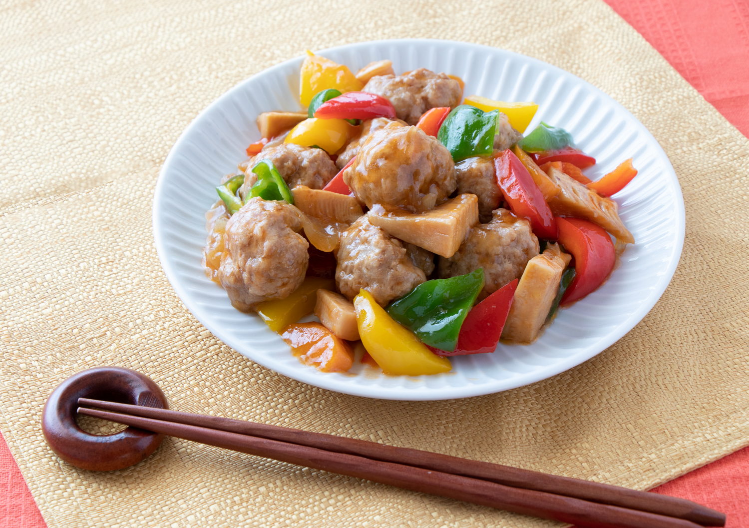 - 始めに【強火モード】を選び、ごま油を熱して、玉ねぎ、にんじん、たけのこを炒める。肉団子を生のまま上にのせ、合わせ調味料を加えてふたをする。