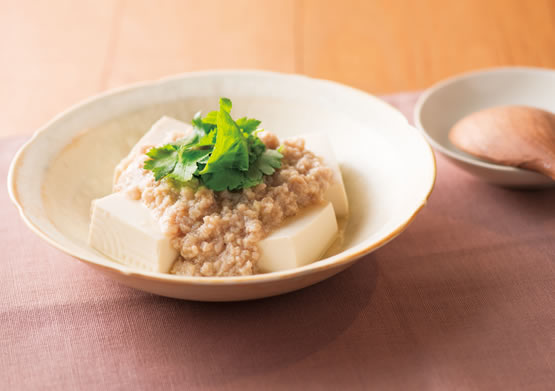 - 器に豆腐を盛り、そぼろあんをかけ、三つ葉をあしらう。