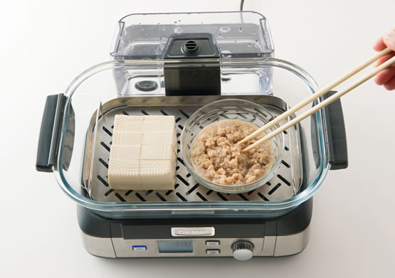 - トレーに1をのせ、【MEATモード】で15分蒸す。残り5分になったら一旦火を止め、菜箸でよく混ぜ8等分に切った豆腐をトレーに並べ、再び蒸す。
